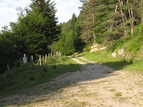 Du col, continuer sur la piste environ 100 m et prendre à droite une piste forestière qui descend ( à l'intersection poteau VTT ). Continuer sur cette piste jusqu'à une nouvelle intersection. Nouveau poteau balisé VTT. Prendre à droite une piste qui descend.
